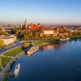 Dominant le majestueux coude de la Vistule, perché sur une colline calcaire, le Château Royal et la Cathédrale du Wawel se dressent, fièrement ancrés dans un site naturellement fortifié. Ce joyau architectural, parmi les plus emblématiques d'Europe et l'un des plus grands et importants châteaux de Pologne, a été édifié et orné dès ses origines par les plus talentueux artisans italiens, soucieux d'une beauté sans égale.